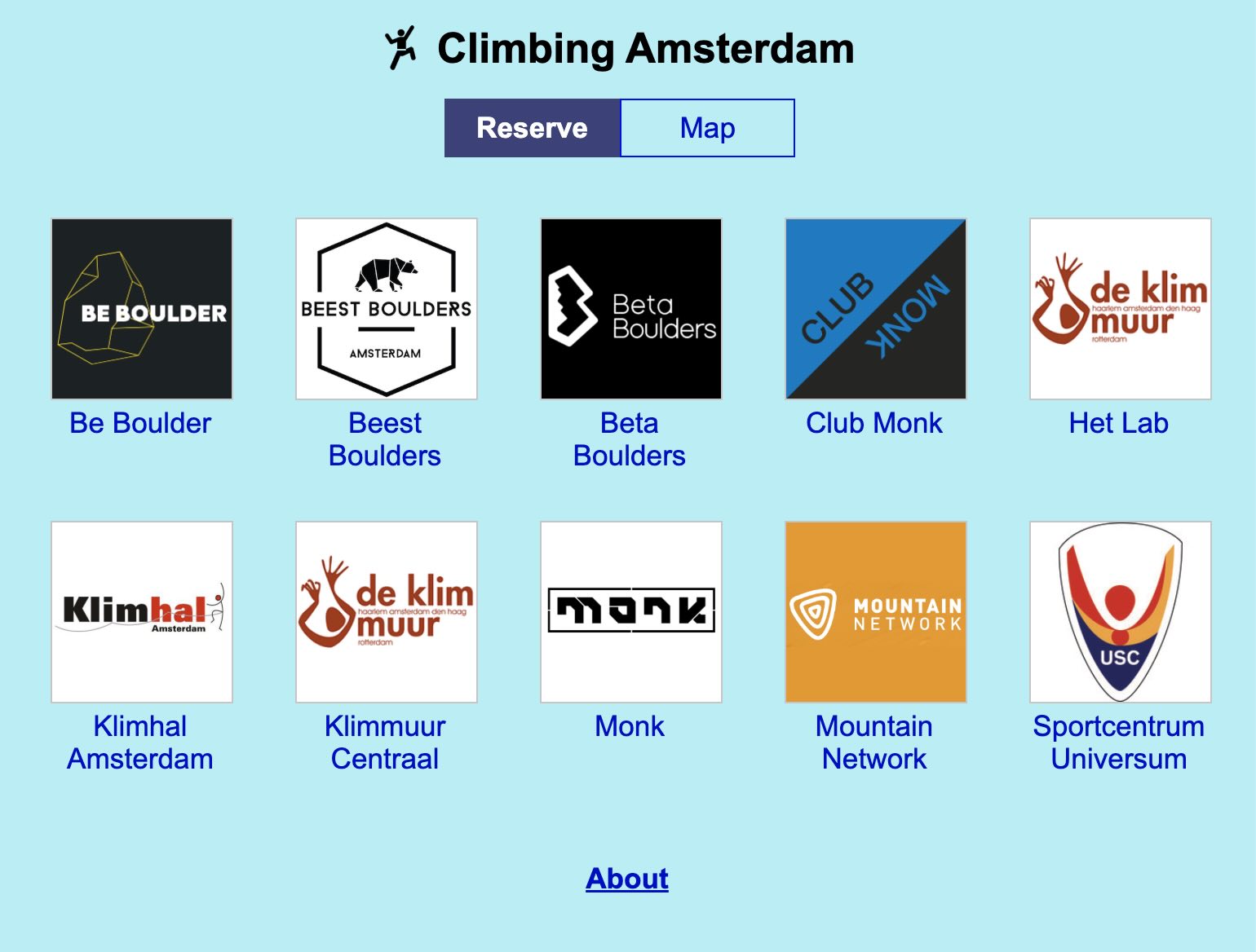 In 2020, during the COVID-19 pandemic, climbing gyms in Amsterdam required visitors to reserve time slots in advance to reduce the risk of infection. I noticed there was no clear overview of all climbing gyms in the city, nor a quick way to access their reservation systems.