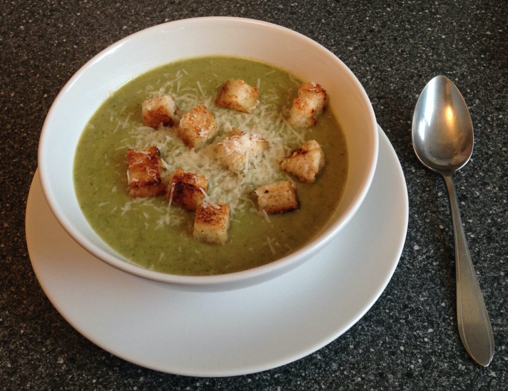 4. Broccoli-cheese soup (parmesan and cheddar) with croutons. Recipe.