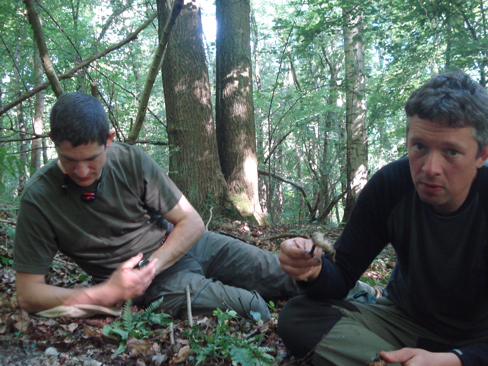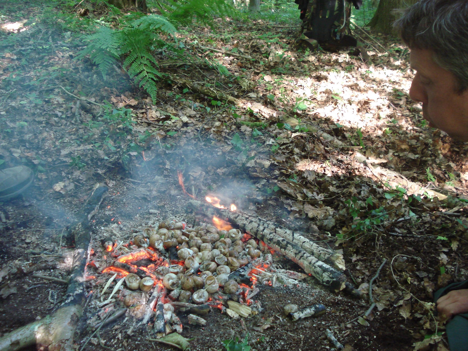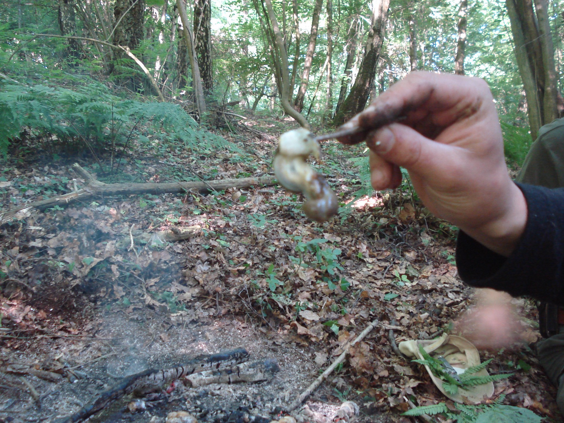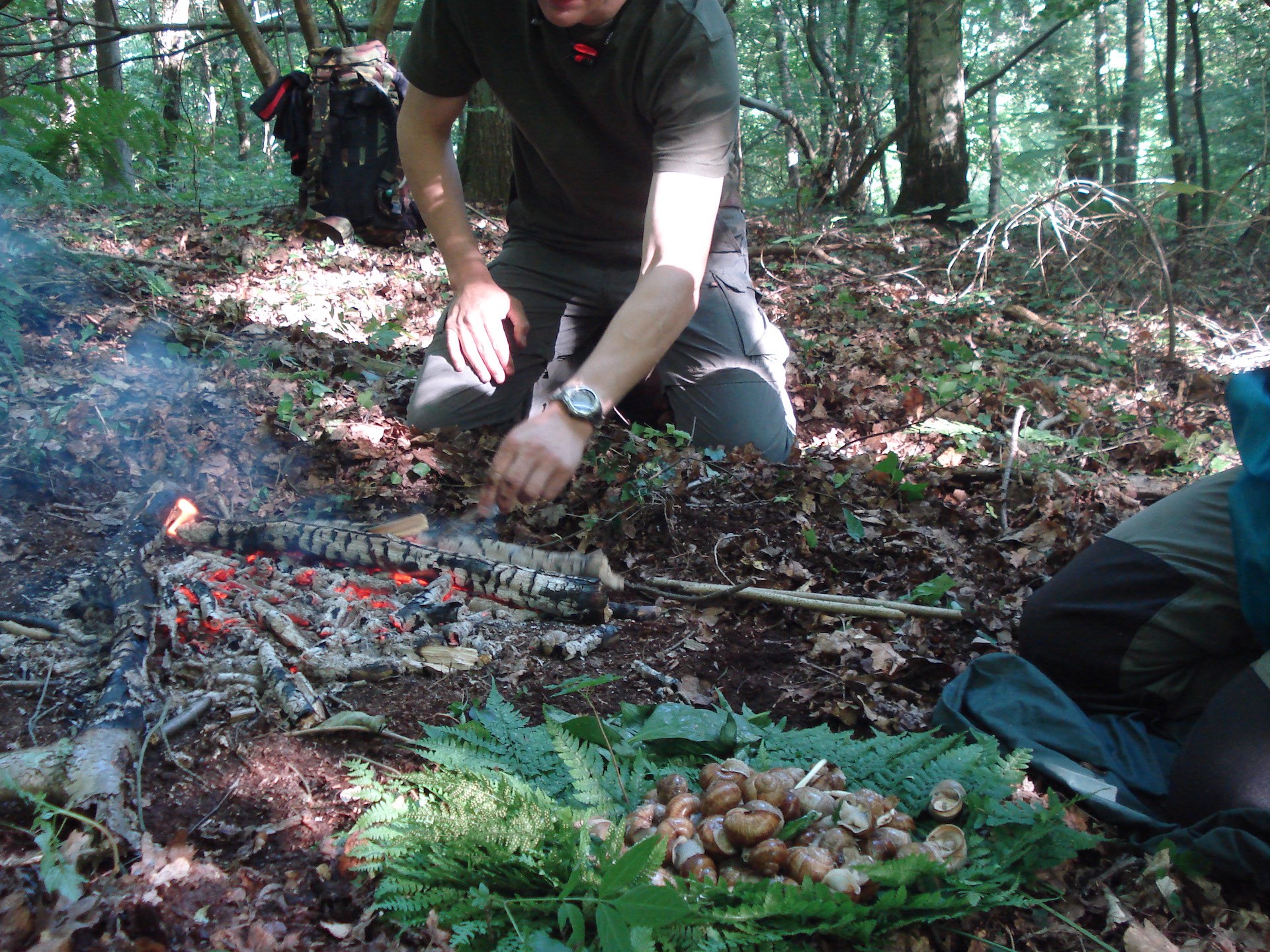 We slept in the woods under wool blankets and tarps, we only carried water bags in our packs and we hoped to find some food in nature on the way. Unfortunately, we only found some wild garlic (Dutch: daslook) and some Burgundy snails that we cooked on a campfire (tasted pretty bad).