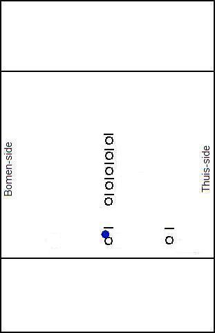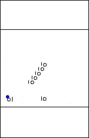 Repositioning of the stack 1 - If, for some reason, the disc ends up on the side-line, the stack repositions diagonally towards the disc. The dump remains available in the middle of the field at 90 degrees from the disc-possessor.Repositioning of the stack 2 - Same on the other side-line.Keep your defender busy - Although normally only one player at a time makes a cut to receive the disc, the other players should keep their defender busy by making "mini-cuts" to prevent their defender intercepting the disc. Make sure though you don't cut into the space of the player making the "real" cut.